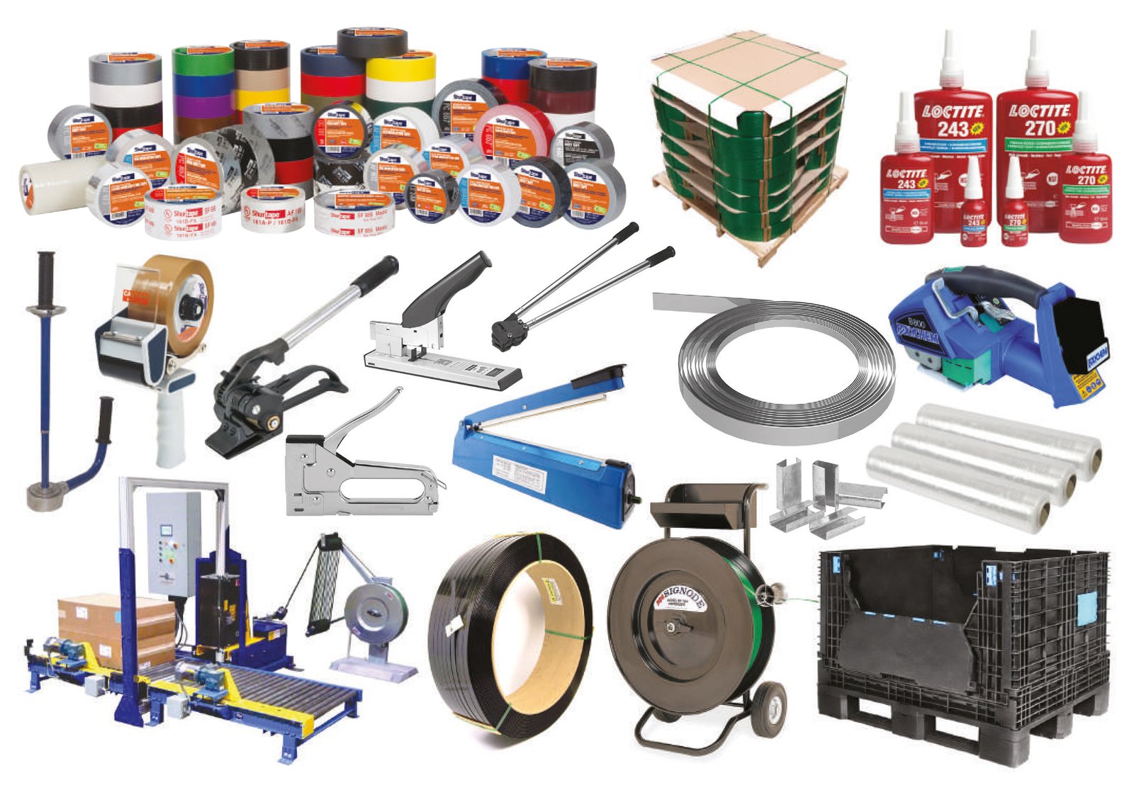 Contamos con una amplia gama de productos, así como las marcas especializadas en todo tipo de pegamentos, cintas adhesivas, y las herramientas para el flejado y protección de tus productos.